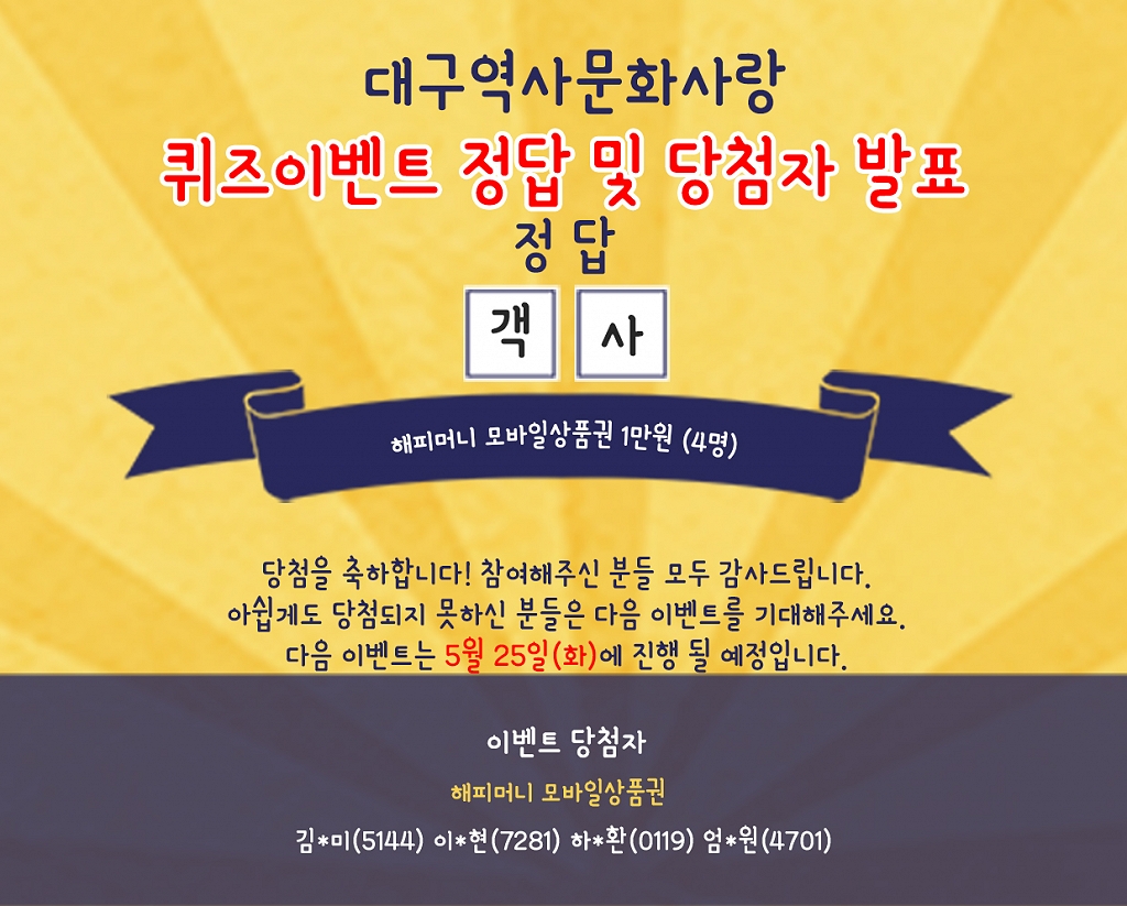| 다음글 | 대구역사문화사랑 퀴즈이벤트 응모기간 5월 18일(화) ~ 5월 23일... |
