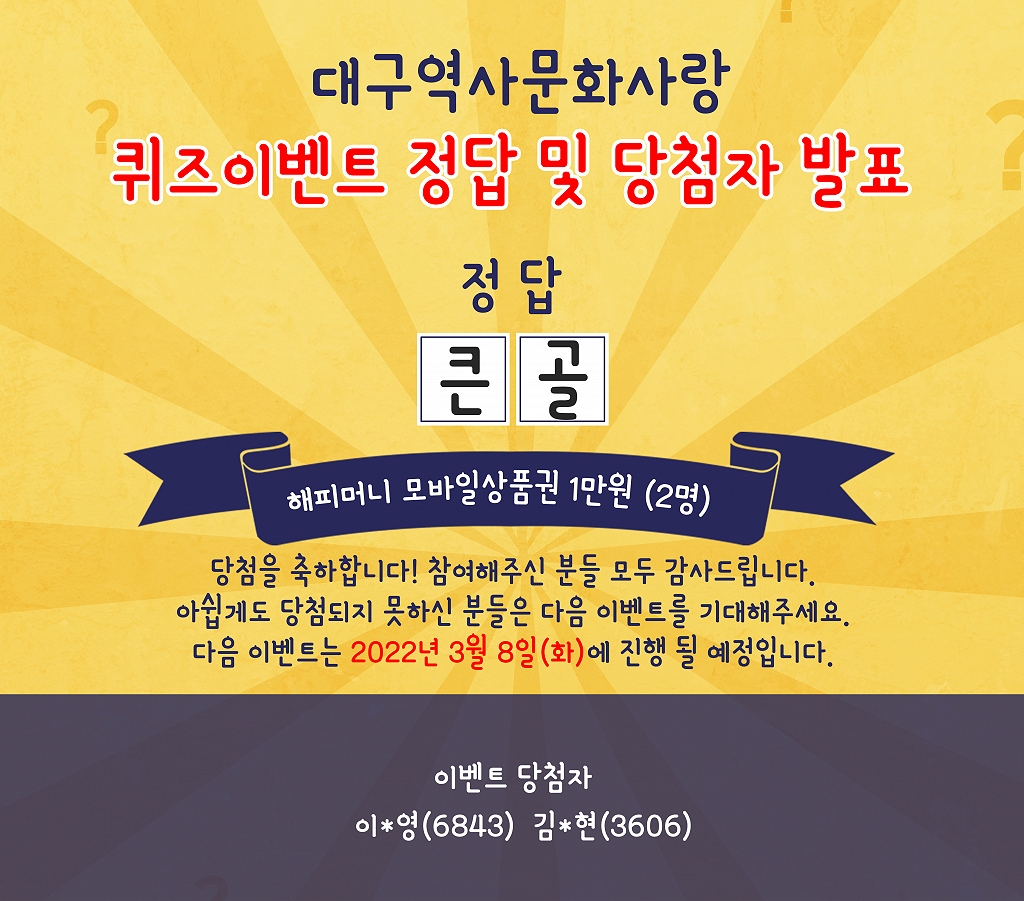 | 다음글 | 대구역사문화사랑 퀴즈이벤트 응모기간 3월 2일(수) ~ 3월 6일(... |